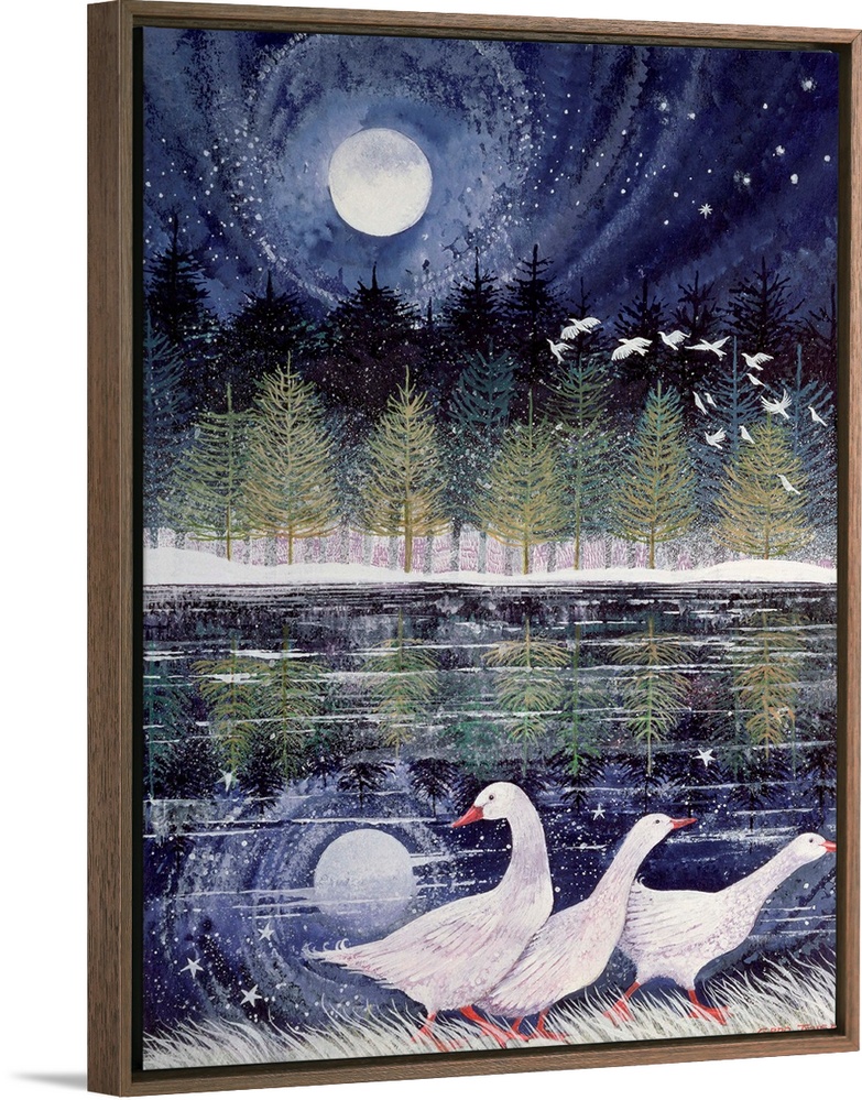 <p>Contemporary painting of three geese at the edge of a lake in the moonlight.</p>