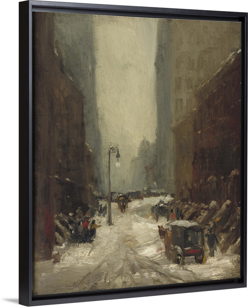 <p>Snow in New York, by Robert Henri, 1902, American painting, oil on canvas. Brownstone apartments and office buildings during a snow storm on March 5, 1902. Already the snow in the street is becoming gray slush under horse cart wheels (BSLOC_2016_6_75)</p>