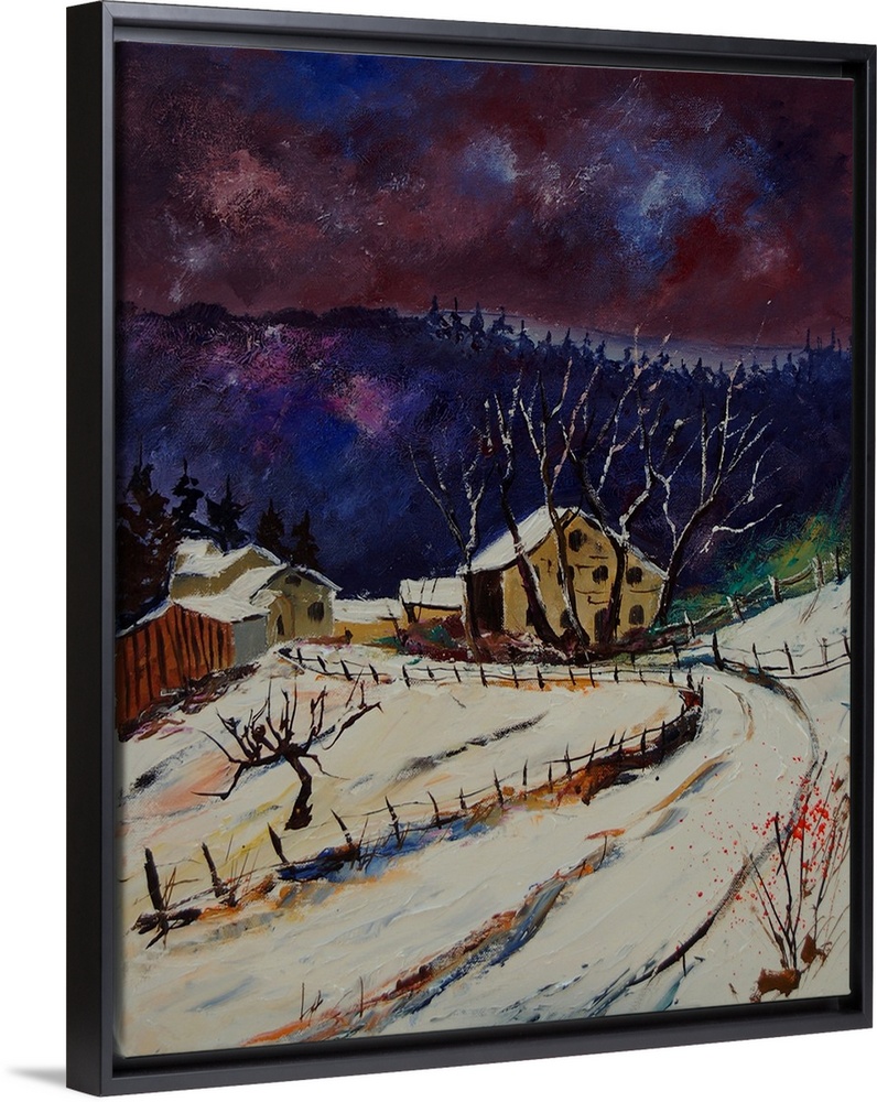 <p>Vertical painting of a road leading to a snow covered village in Belgium in the evening.</p>