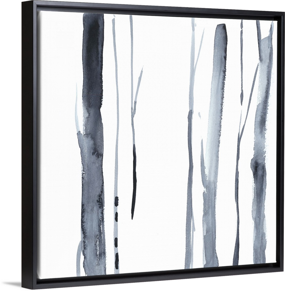 <p>Square watercolor painting of abstract tree trunks in gray against a white background.</p>