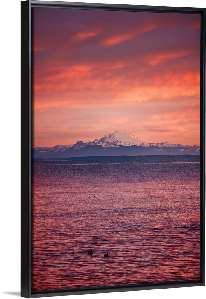 <p>Mt Baker under the fiery sky before sunrise at Port Williams Beach in Washington State.</p>