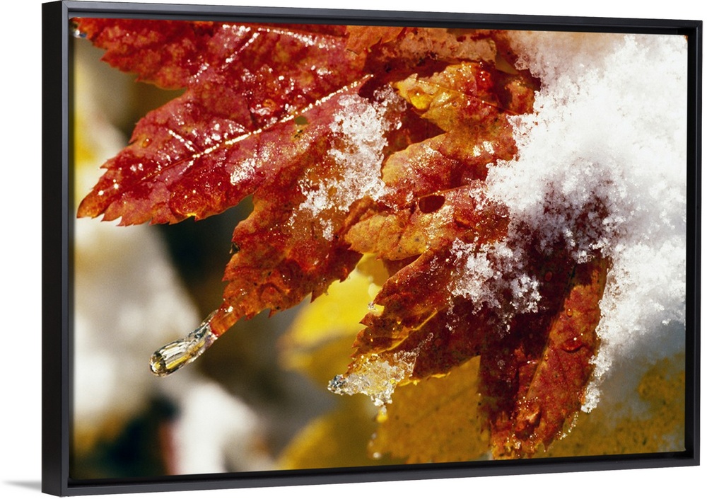 <p>Fall colored leaves are photographed closely as they are covered with snow and ice.</p>