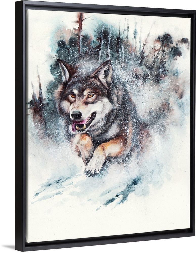 <p>A watercolor painting of a running wolf in snow</p>