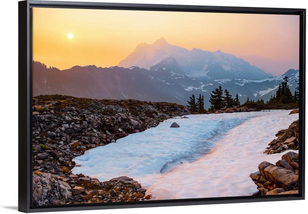 <p>View of a snowy path on Artist Point Trail with the sun rising over Mount Shuksan in the background, Washington.</p>