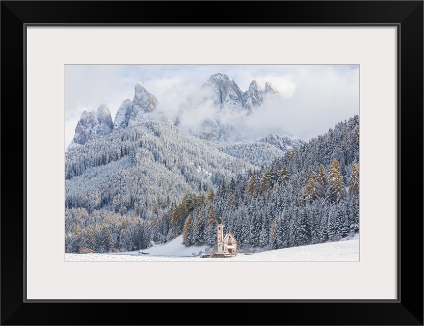 <p>Snow, winter, St Johann Church, Val di Funes, Dolomites, Italy</p>