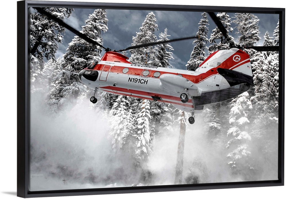 <p>A helicopter lifts up off the ground, sending snow flying away.</p>