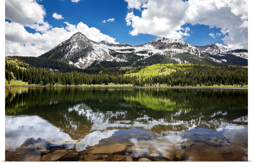 <p>Snowcapped East Beckwith mountain in the background reflected in Lost Lake Slough; Colorado, United States of America</p>