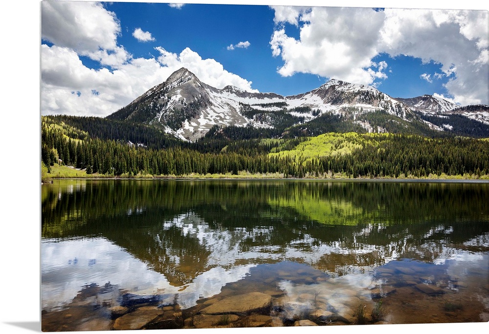 <p>Snowcapped East Beckwith mountain in the background reflected in Lost Lake Slough; Colorado, United States of America</p>