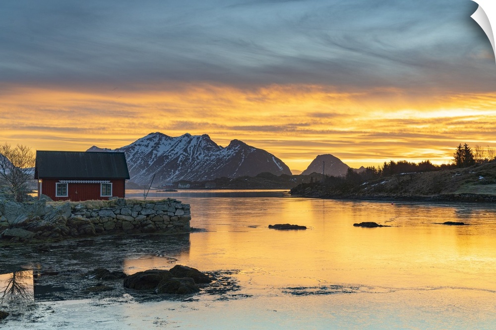 <p>Snowcapped mountains and fisherman's red cabin under the burning sky at dawn, Ballstad, Vestvagoy, Lofoten Islands, Norway, Scandinavia, Europe</p>