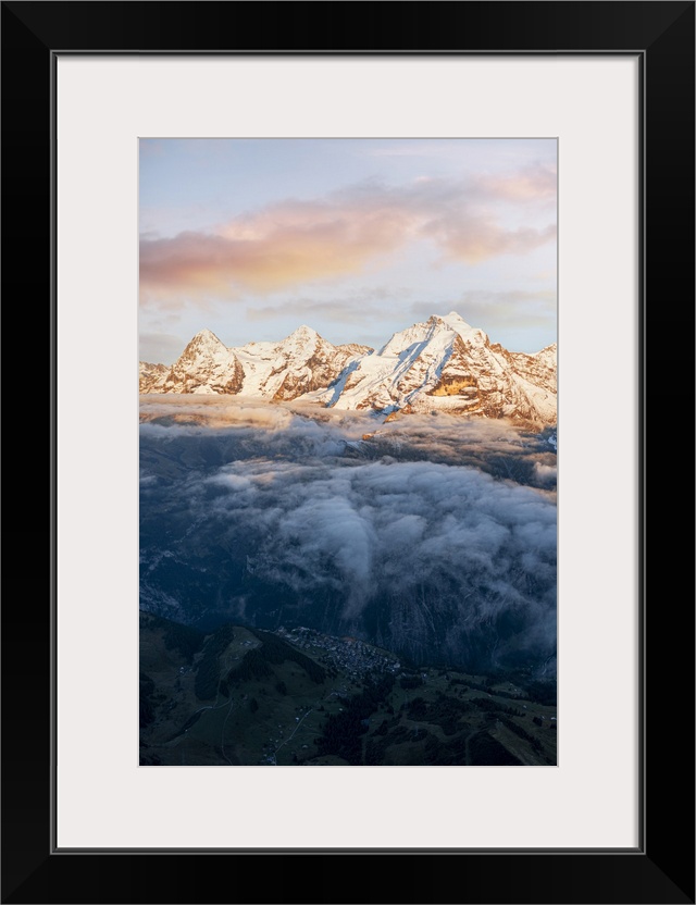 <p>Aerial view of snowcapped peaks of Eiger, Monch and Jungfrau in fog at sunset, Murren Birg, Jungfrau Region, Bern, Swiss Alps, Switzerland, Europe</p>
