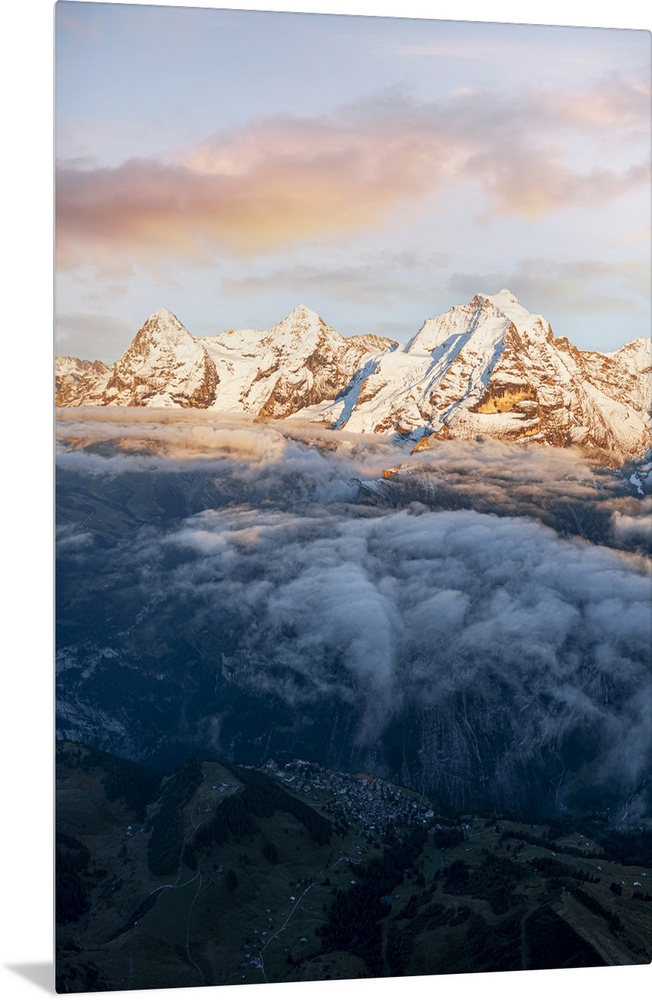 <p>Aerial view of snowcapped peaks of Eiger, Monch and Jungfrau in fog at sunset, Murren Birg, Jungfrau Region, Bern, Swiss Alps, Switzerland, Europe</p>