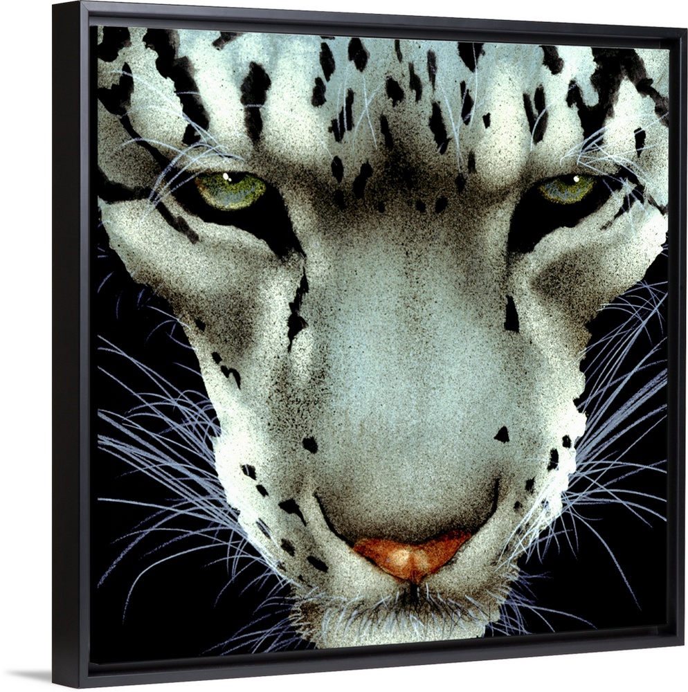 <p>Contemporary artwork of a snow leopard portrait against a black background.</p>
