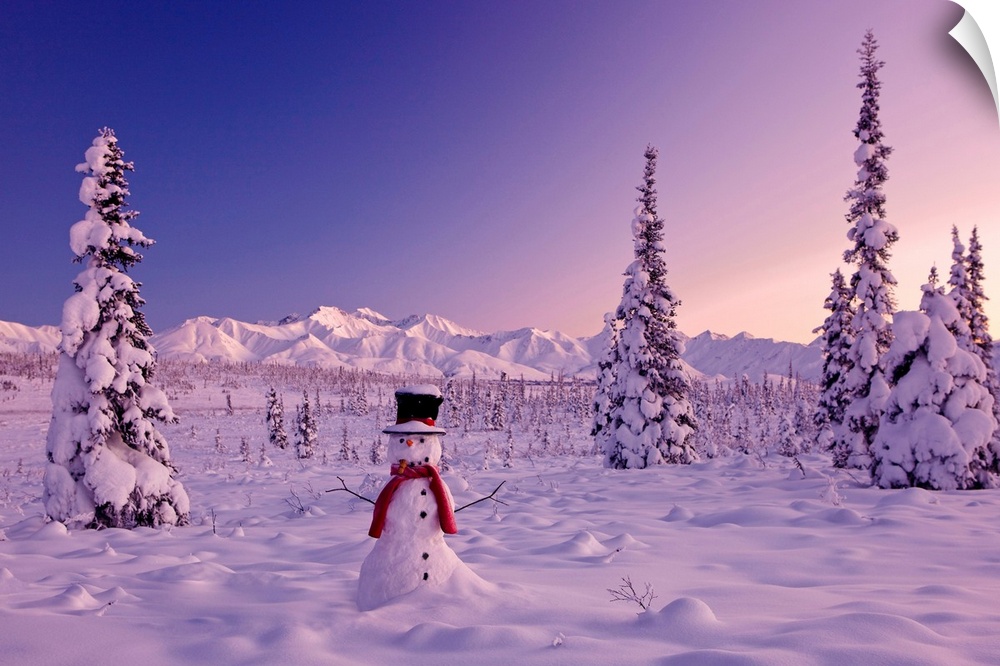<p>Large canvas photo of a snowman sitting in a snowy landscape with mountains in the distance and snow covered trees surrounding it.</p>