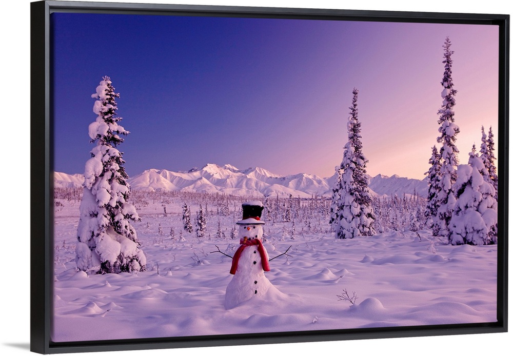 <p>Large canvas photo of a snowman sitting in a snowy landscape with mountains in the distance and snow covered trees surrounding it.</p>