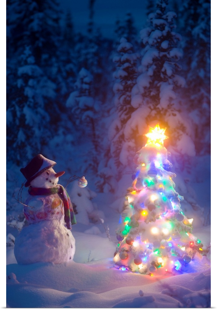 <p>Festive scene of a snowman happily looking upon a Christmas tree covered in lights and a glowing star in a snowy forest.</p>