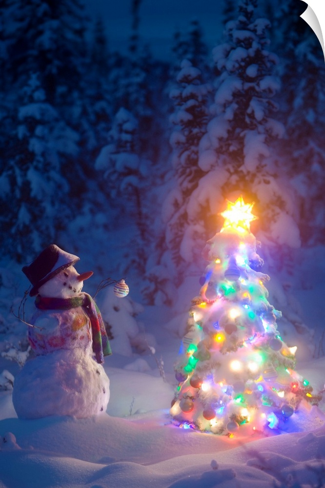 <p>Festive scene of a snowman happily looking upon a Christmas tree covered in lights and a glowing star in a snowy forest.</p>