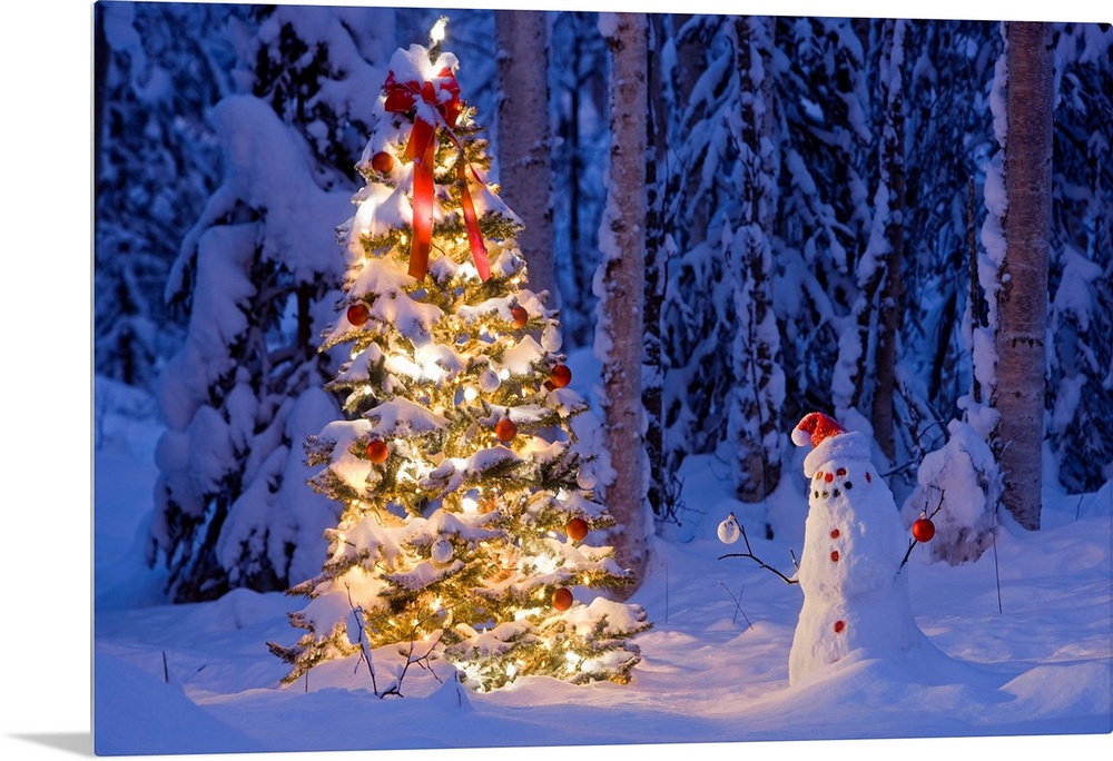 <p>Snowman with Kris Kringle hat holding decorations next to a tree with ribbons, lights, and other embellishments in a snow covered forest.</p>