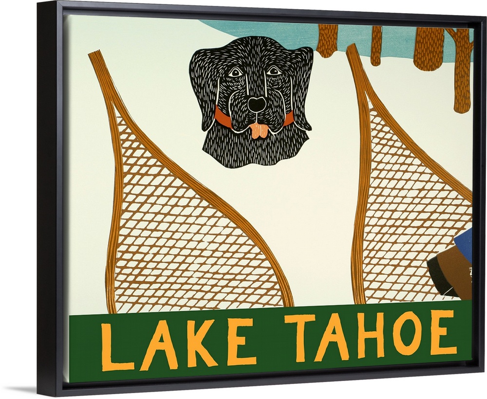 <p>Illustration of a black lab buried in the snow with a set of snowshoes in front of it and "Lake Tahoe" written on the bottom.</p>