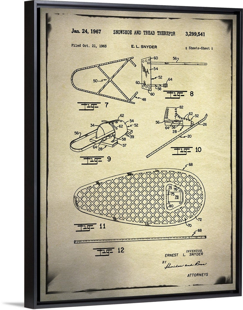 <p>Blueprint diagram depicting the parts of a snowshoe.</p>