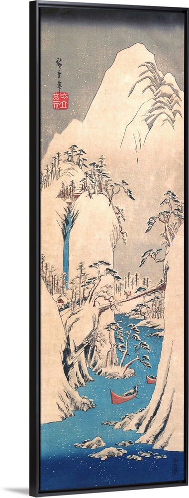 <p>Hiroshige began his career at about age fifteen as a student of Utagawa Toyohiro (1773-1828), who was known for his prints of landscapes and beautiful women. He also studied Japanese literati painting. Hiroshige's predilection for landscapes may have been fostered by such early influences. His course in this genre was set by the enormous success of his best-known landscape series, Fifty-three Stations of the Tokaido, published by Hoeido on the basis of sketches made during a trip to Kyoto in 1832. A special fondness for snow-covered landscapes and falling snow pervades his work. The depiction of falling snow fully exploits the woodblock medium: after the block has been carved, the unprinted paper supplies the whiteness. In this snow scene, one of Hiroshige's finest, probably made in 1841, the figures crossing the bridge and in the boats on the Fuji River are so small that they become almost a part of nature, emphasizing the monumentality of the mountains. Hiroshige creates a silent poetry of landscape.</p>