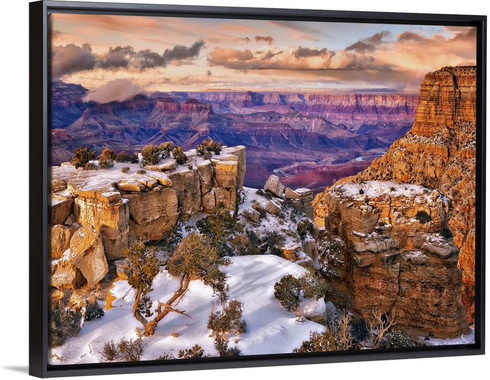 <p>Vista of the Grand Canyon in Arizona on a cloudy day under a blanket of snow.</p>