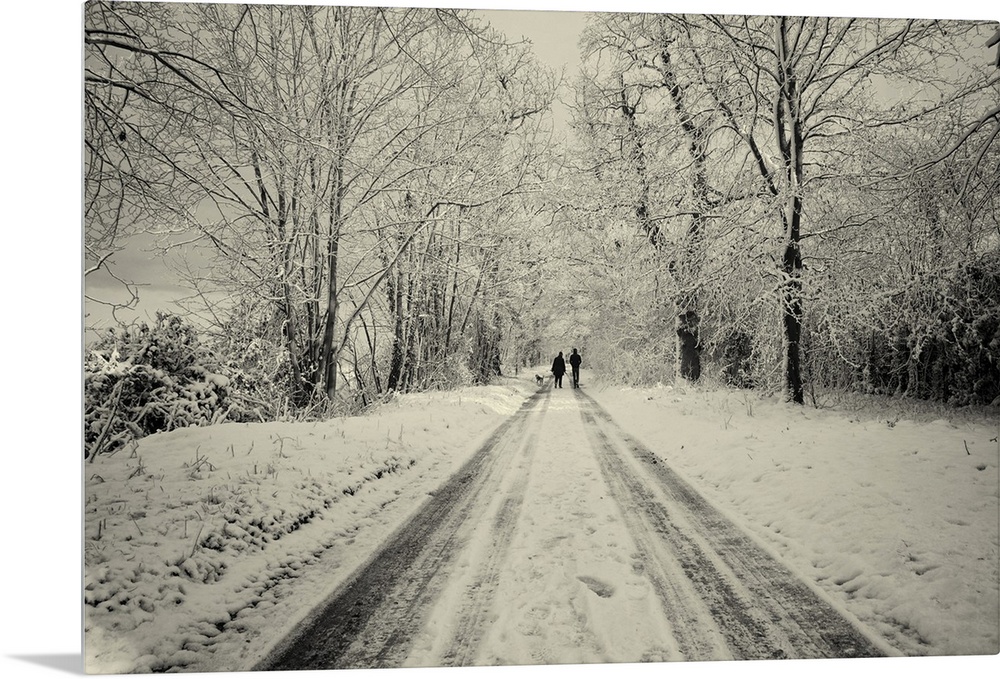 <p>Wintry lane in Suffolk, England with two figures in the distance.</p>
