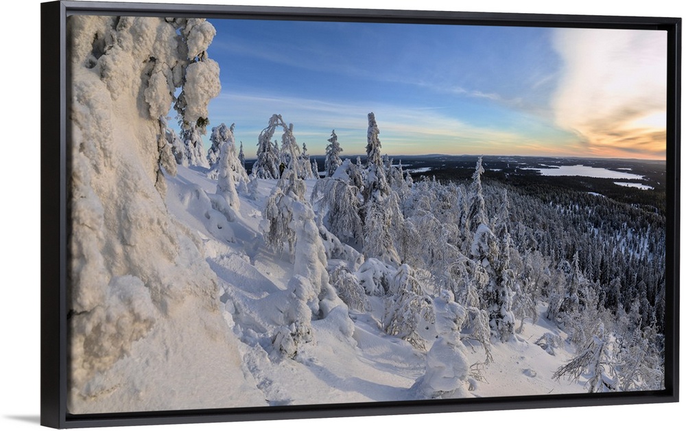 <p>Panorama of snowy landscape and woods framed by blue sky and sun, Ruka, Kuusamo, Ostrobothnia region, Lapland, Finland</p>