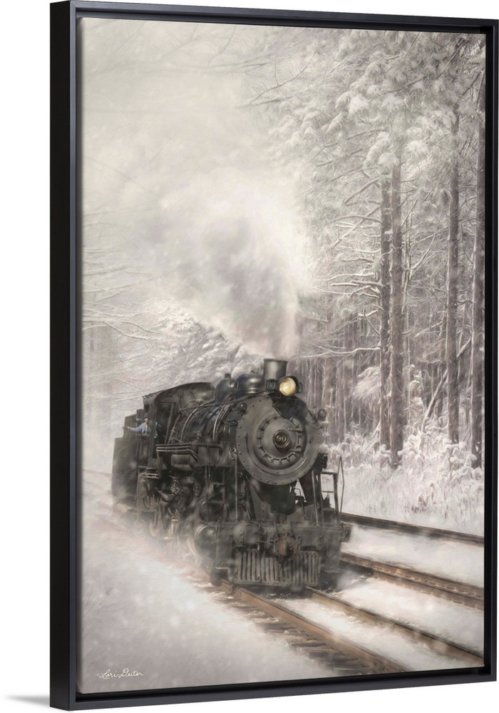 <p>Contemporary artwork of a steam engine driving through a forest during a snowstorm.</p>
