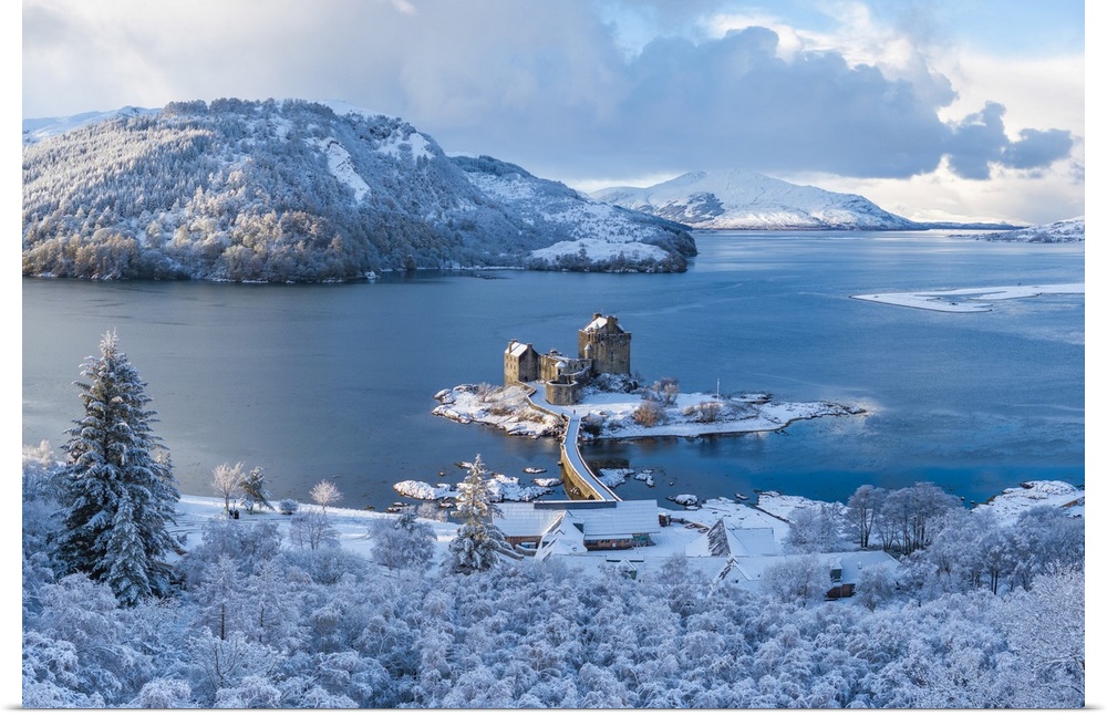 <p>Snowy morning at Eilean Donan Castle on Loch Duich, Dornie, Western Highlands, Scotland, United Kingdom</p>