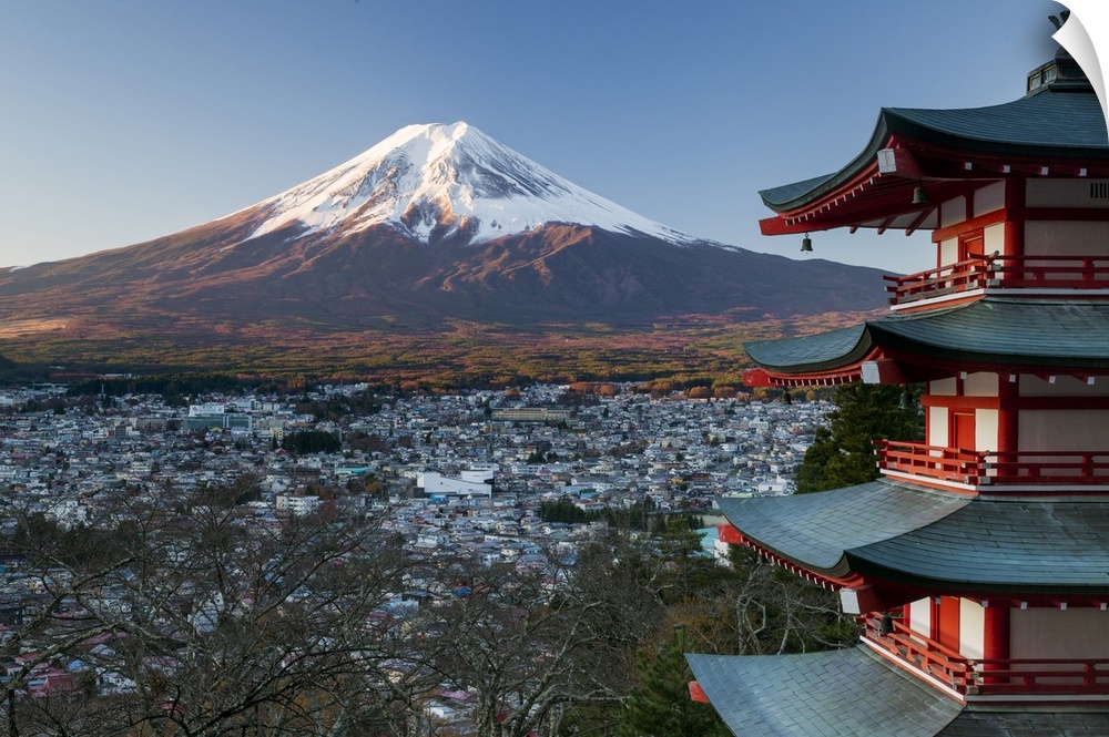 <p>Snowy Mount Fuji and Chureito Pagoda at Arakura-yama Sengen-koen Park, Fujiyoshida, Shizuoka, Honshu, Japan, Asia</p>