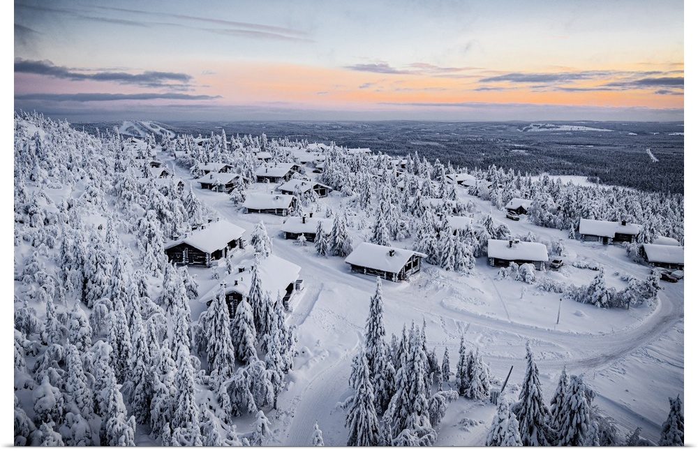 <p>Snowy mountain huts in the frozen forest at sunset, Pudasjarvi, Iso Syote hill, Lapland, Finland</p>