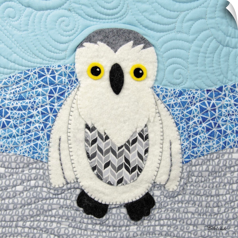 <p>Square sewn art with a snowy white owl on a patterned background.</p>