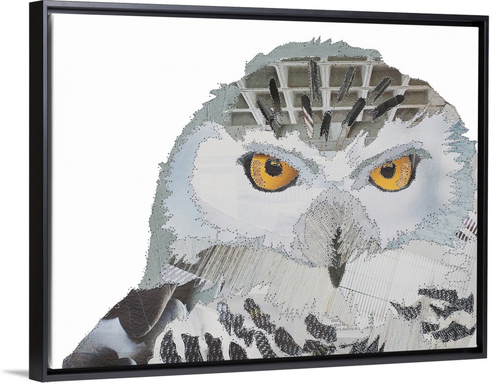 <p>Horizontal artwork of a snow owl in a collage style outlined in stitches.</p>