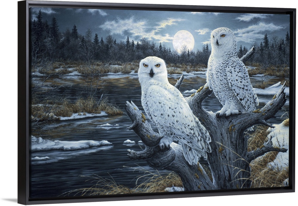 <p>a pair of white owls perched in the top of a dead tree with the moon rising in the background</p>