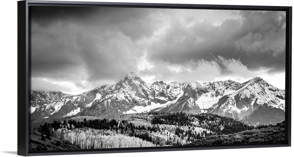 <p>Black and white landscape photograph of snowy mountains under a cloudy sky.</p>