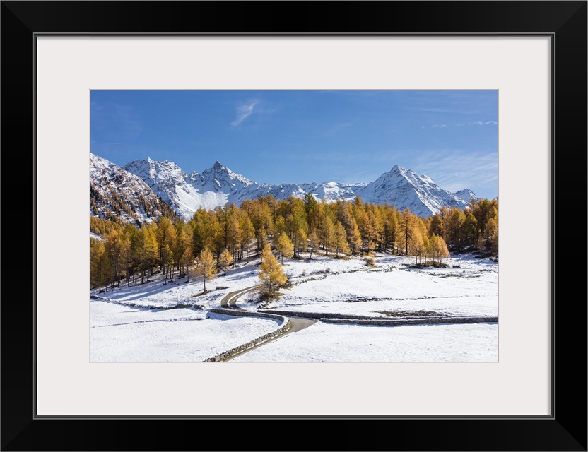 <p>Blue sky on the snowy peaks and yellow larches, Bernina Pass, Poschiavo Valley, Canton of Graubunden, Engadine, Switzerland, Europe</p>