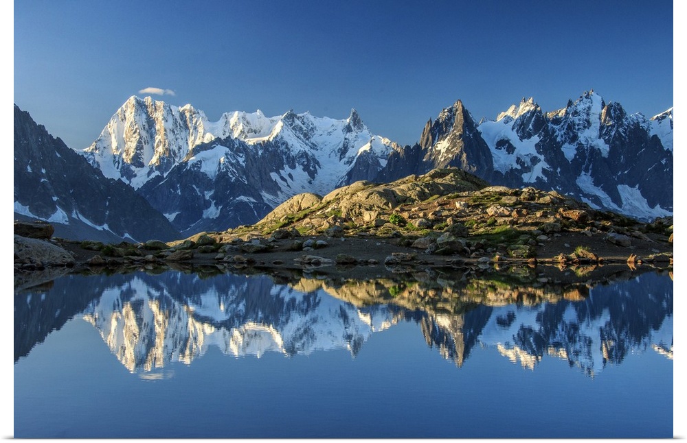 <p>Snowy peaks of Dent Du Geant and Grandes Jorasses are reflected in Lac Blanc, Haute Savoie, France, Europe.</p>
