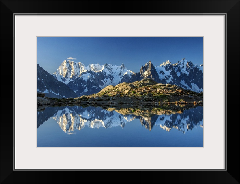 <p>Snowy peaks of Dent Du Geant and Grandes Jorasses are reflected in Lac Blanc, Haute Savoie, France, Europe.</p>