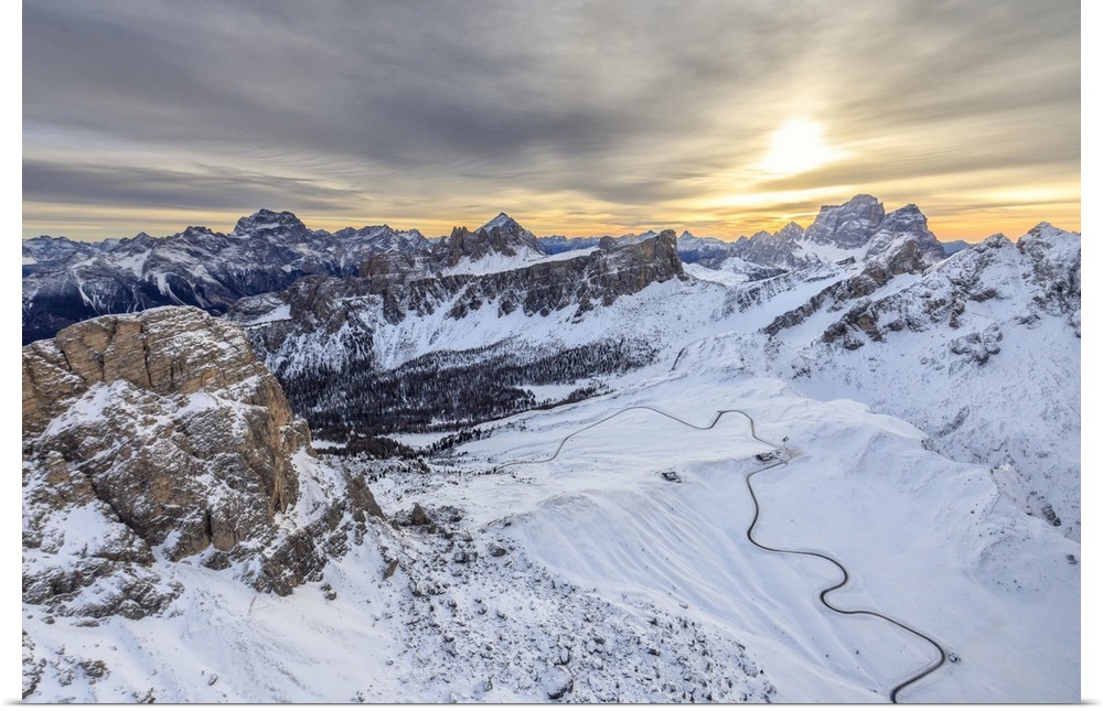 <p>Aerial view of the snowy peaks of Giau Pass Ra Gusela and Lastoi De Formin, Cortina d'Ampezzo, Dolomites, Veneto, Italy</p>