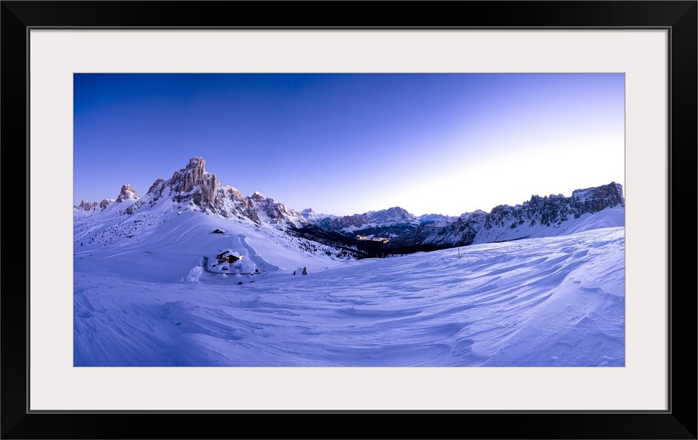 <p>Pano of snowy Ra Gusela, Cortina d'Ampezzo, Monte Cristallo and Lastoi De Formin at dusk, Giau Pass, Dolomites, Veneto, Italy, Europe</p>