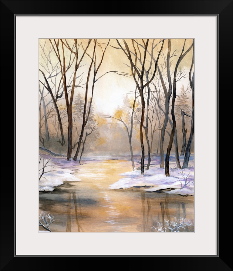 <p>Landscape painting of a river lined with snow and tall bare Winter trees during a golden sunset.</p>