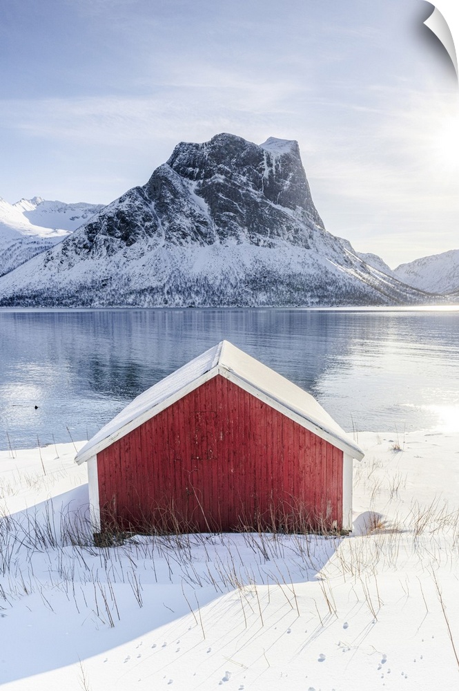 <p>Snowy rorbu overlooking the frozen sea, Bergsfjorden, Senja, Troms county, Norway</p>