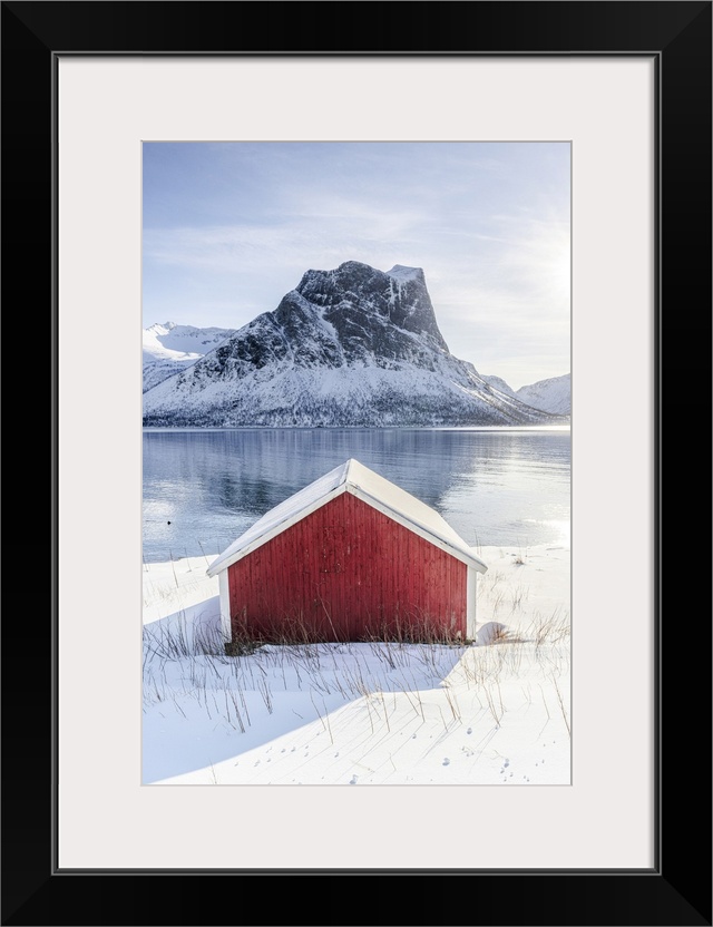 <p>Snowy rorbu overlooking the frozen sea, Bergsfjorden, Senja, Troms county, Norway</p>