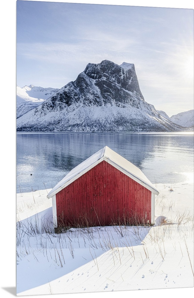<p>Snowy rorbu overlooking the frozen sea, Bergsfjorden, Senja, Troms county, Norway</p>