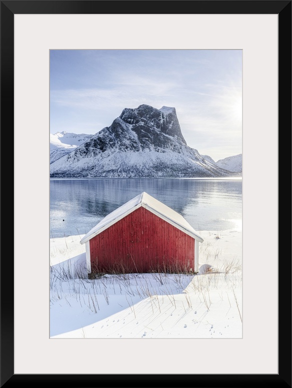 <p>Snowy rorbu overlooking the frozen sea, Bergsfjorden, Senja, Troms county, Norway</p>