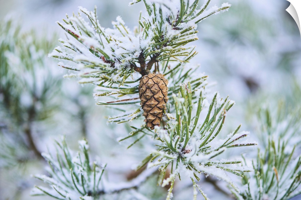 <p>Snowy Scots pine (Pinus sylvestris) cone hanging on a branch at Mount Vapec, Kleine Fatra, Carpathian Mountains, Horna Poruba, Slovakia</p>