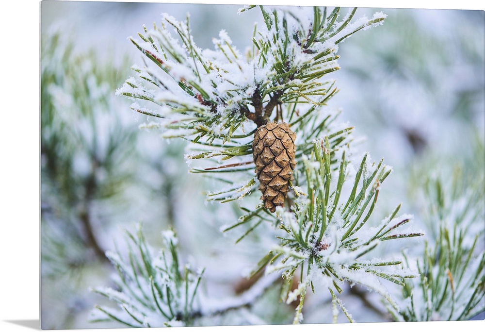 <p>Snowy Scots pine (Pinus sylvestris) cone hanging on a branch at Mount Vapec, Kleine Fatra, Carpathian Mountains, Horna Poruba, Slovakia</p>