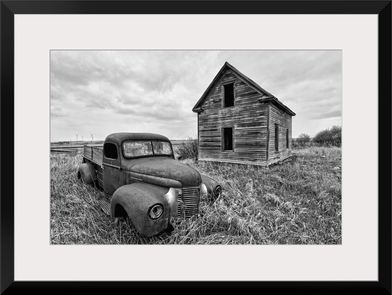 <p>Old rusty pickup truck abandoned in rural location beside old wooden barn in Rolette County USA</p>