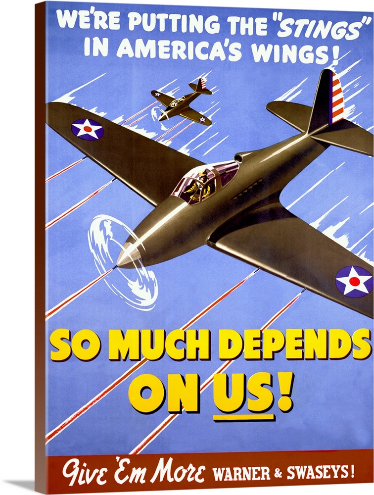 <p>This vibrant WWII poster emphasizes the role of manufacturers like Warner & Swasey in equipping American aircraft. Featuring sleek fighter planes and bright tracer fire, it dramatizes the urgency of production, encouraging workers to contribute more to the war effort with the rousing phrase: "So much depends on us!"</p>