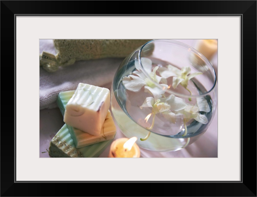 <p>soaps with water bowl of orchids and candle in zen atmosphere</p>